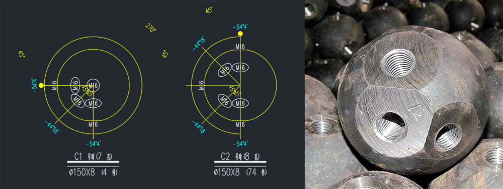 ①、 下弦桿與球的組裝: 根據(jù)安裝圖的編號,墊好墊實下弦球的平面,把下弦桿件與球連接并一次擰緊到位。